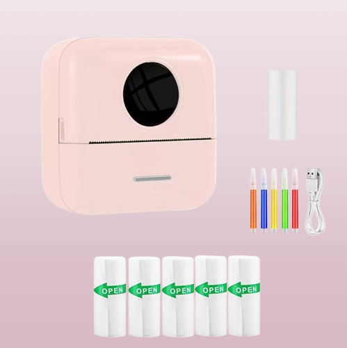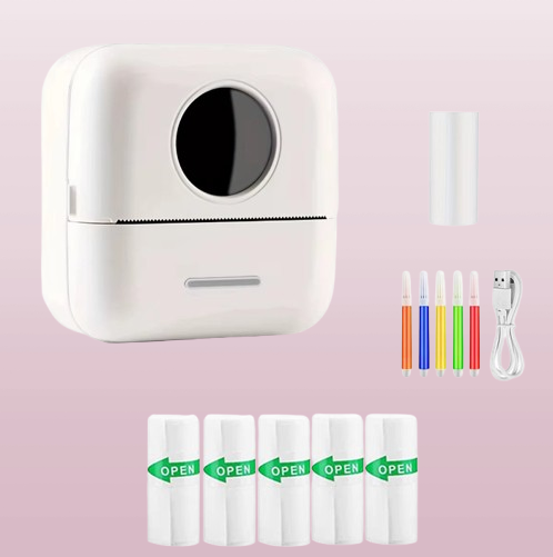 Comes with 5 sticky paper rolls, 5 coloured markers, and a USB charging cable 🎁